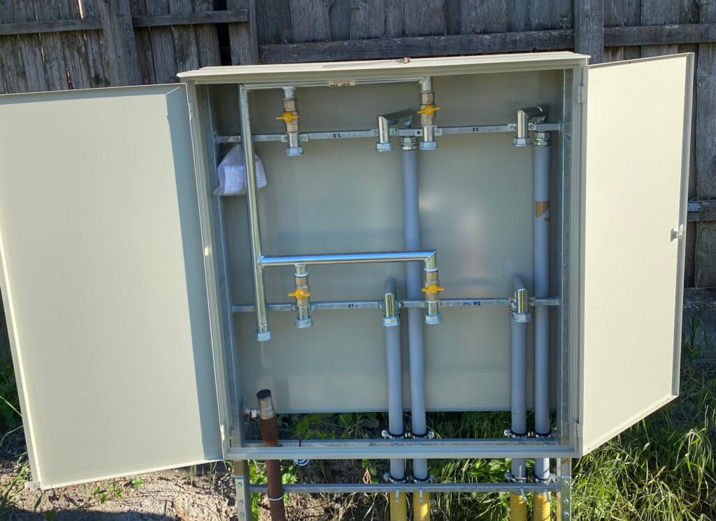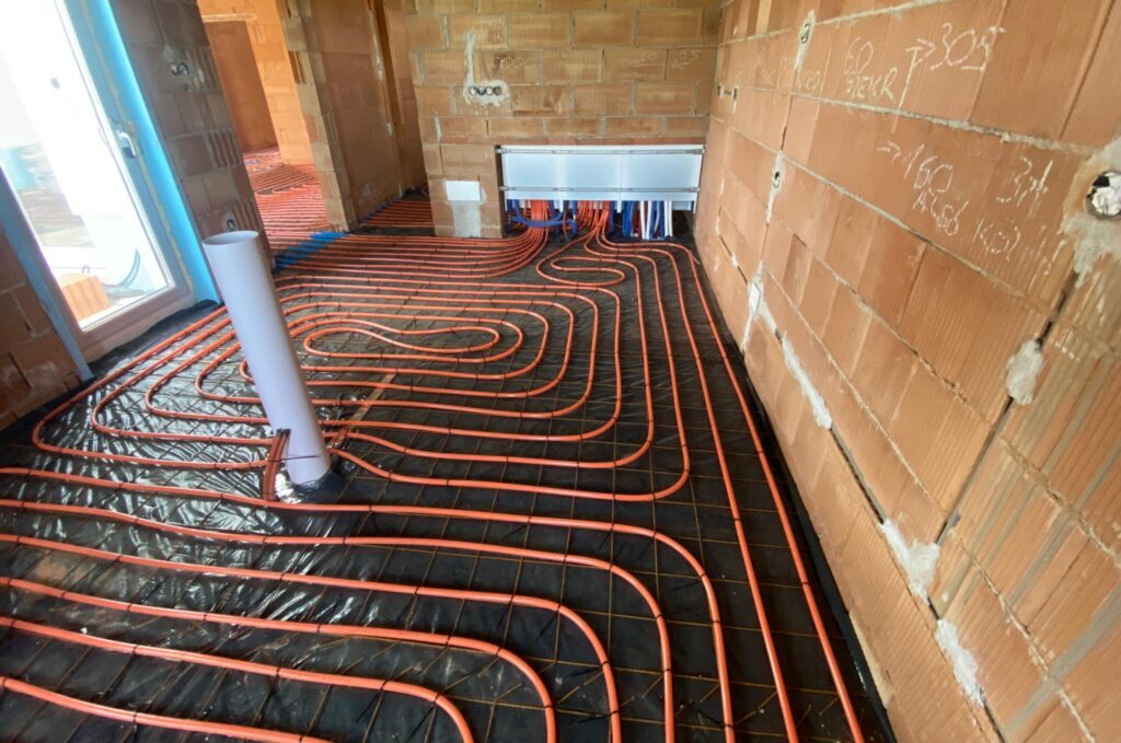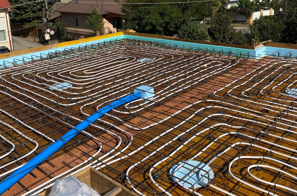 Általános épületgépész kivitelezésből néhány munkánkat emelnénk ki példának. A referencia fotón vashálóra szerelt padlófűtés látható, falba süllyeszthető osztó dobozzal.