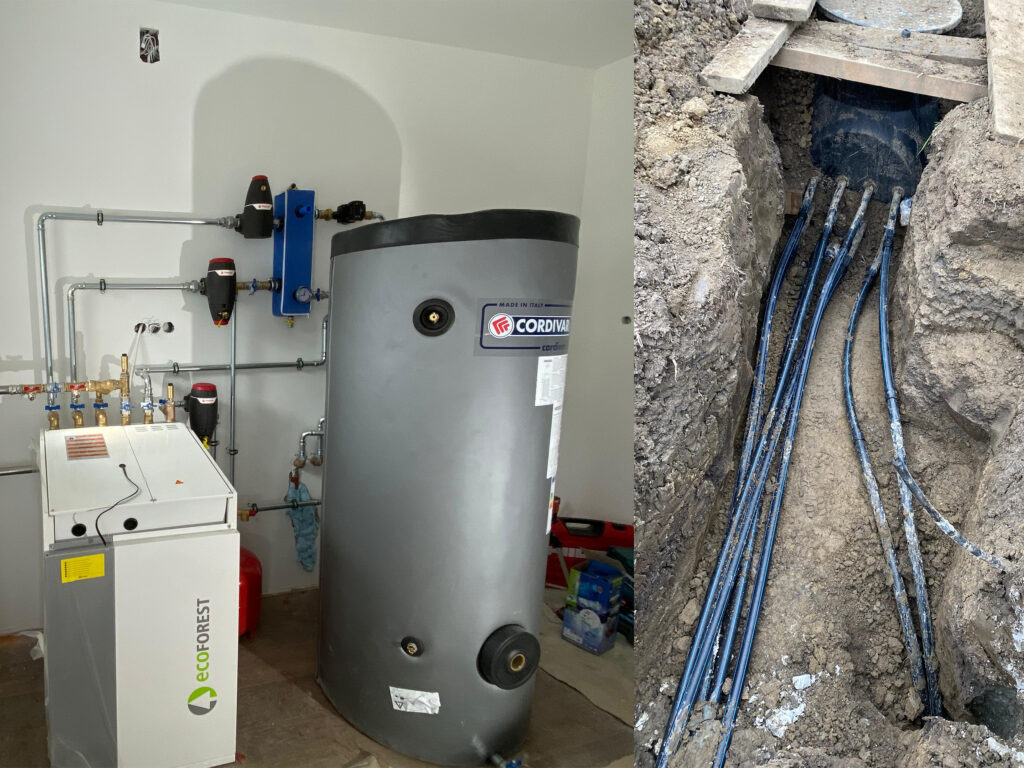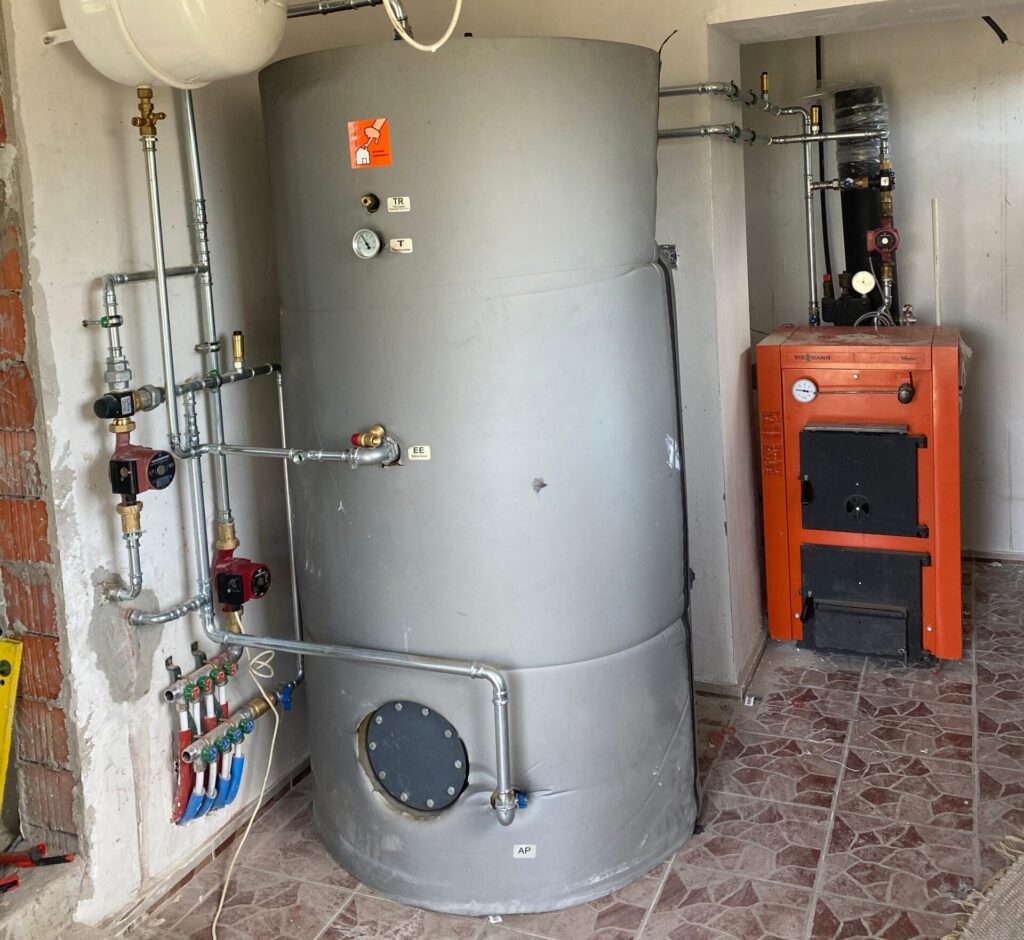 Beruházónak volt egy 1m3-es puffertárolója, amelyhez vásárolt egy szilárd tüzelésű kazánt. Ezekből összeállított fűtési rendszer a csatolt fotón látható.